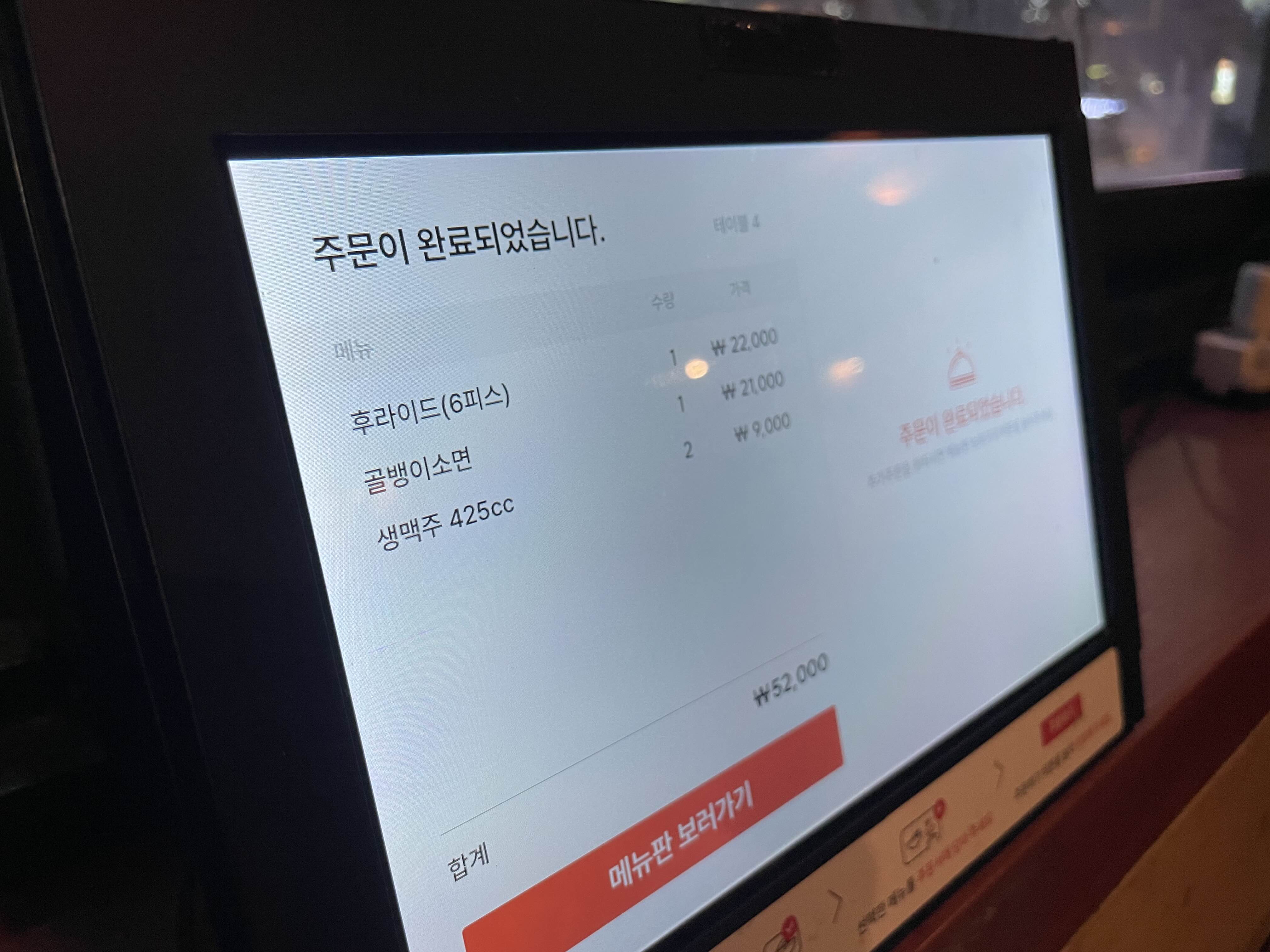 사진 리뷰들 보면서 어떤 것을 많이 먹었는지 보다가 후라이드 치킨과 골뱅이 소면 그리고 생맥주를 두 잔 주문했다.