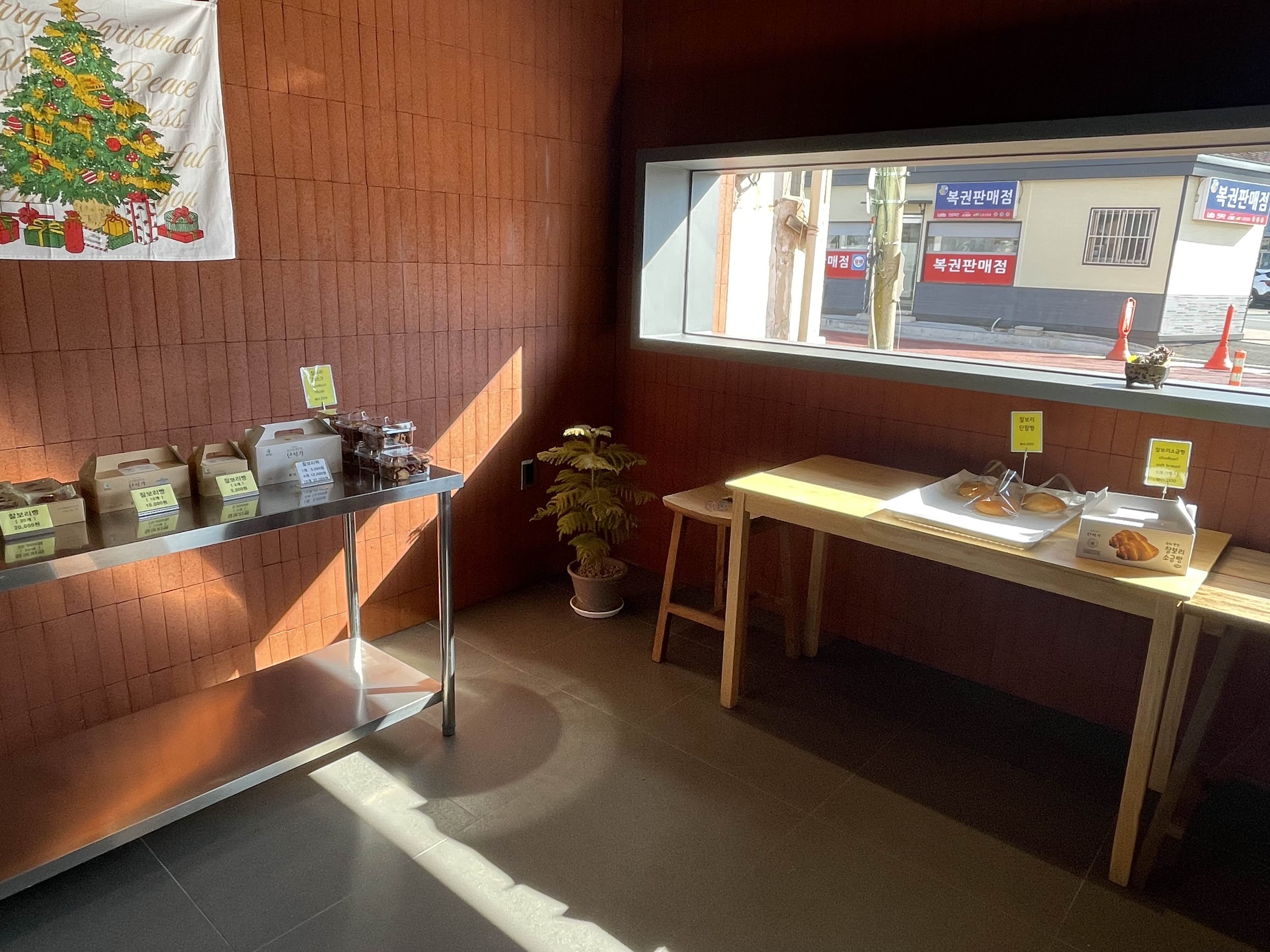 한쪽에는 찰보리빵과 떡 박스가 전시되어 있다.