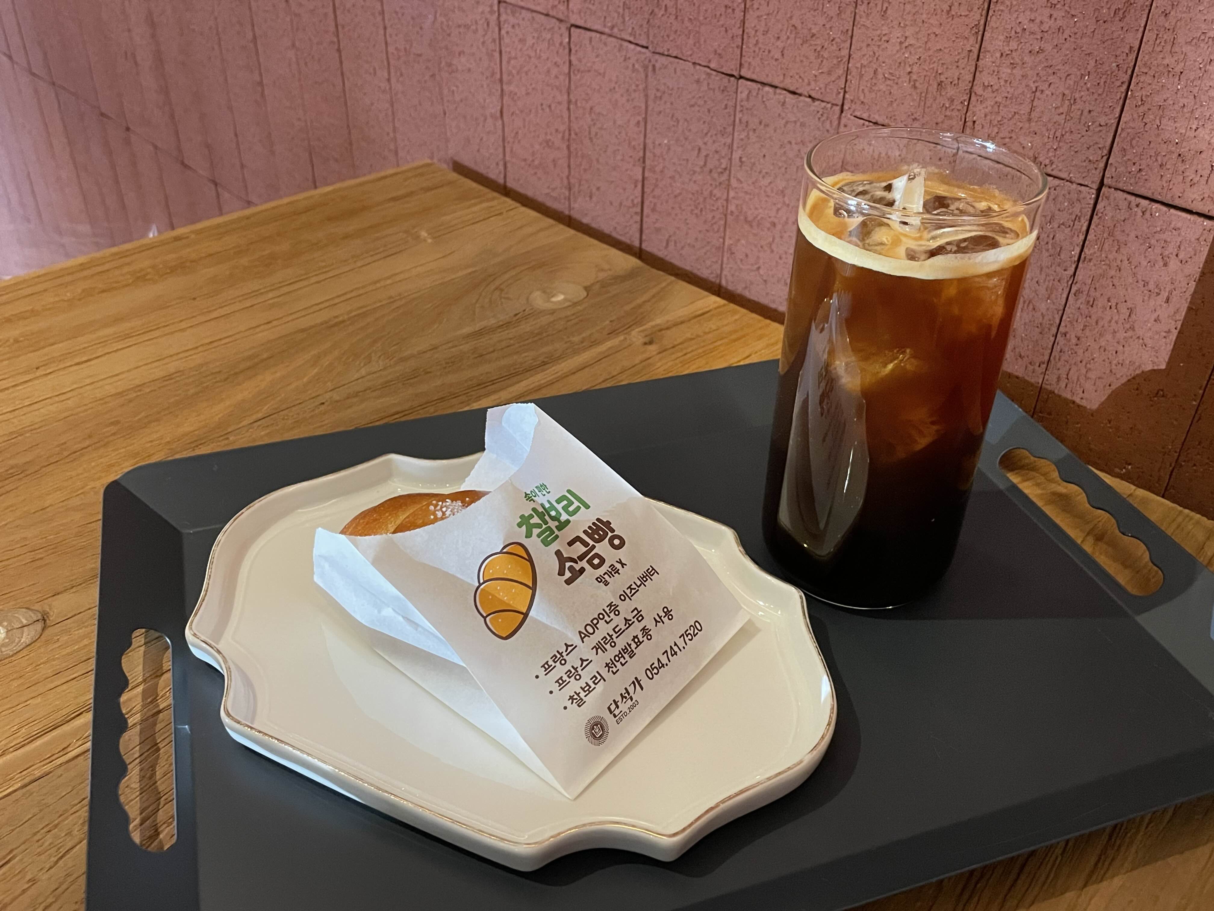 내가 주문한 찰보리 소금빵과 아이스 아메리카카노