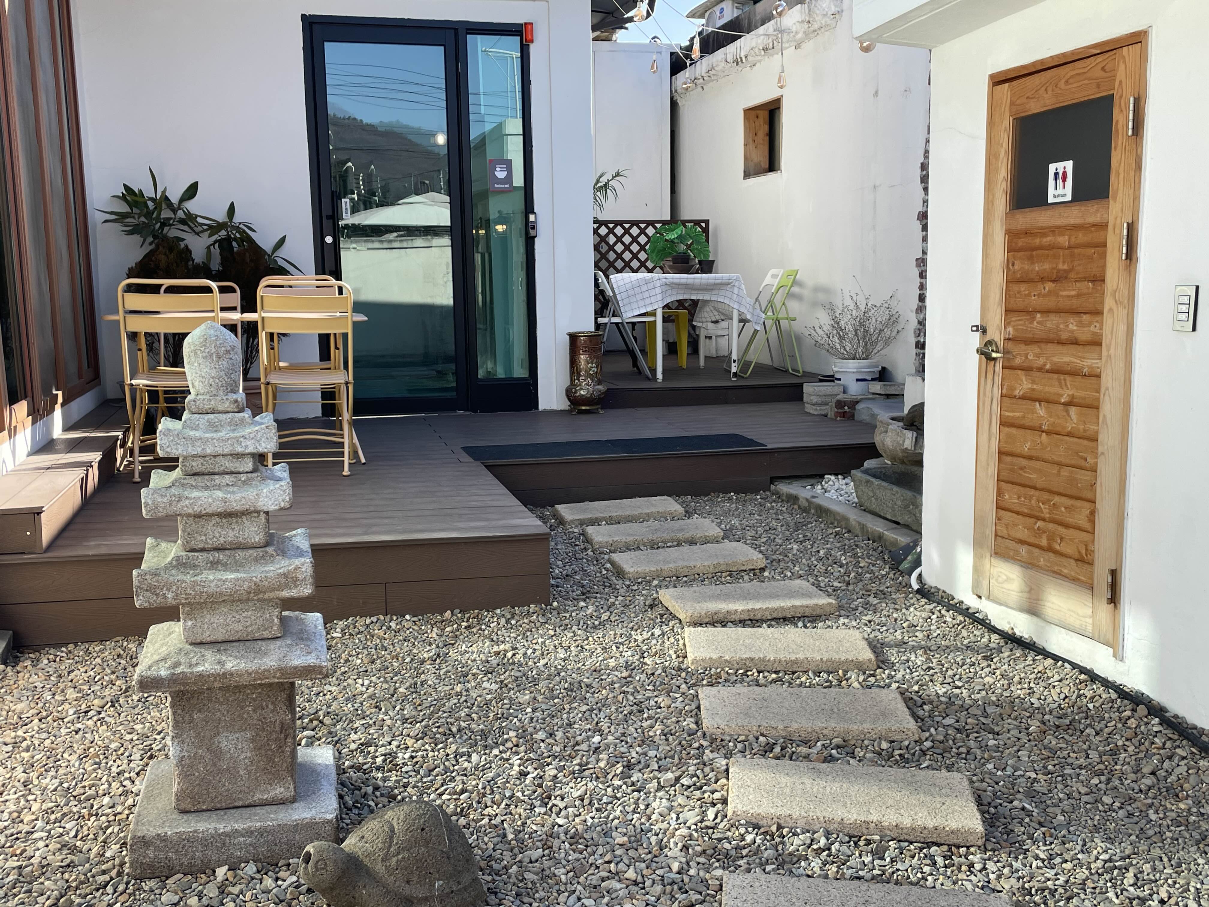 가게 앞에는 작은 거북이 석상과 탑이 있다.