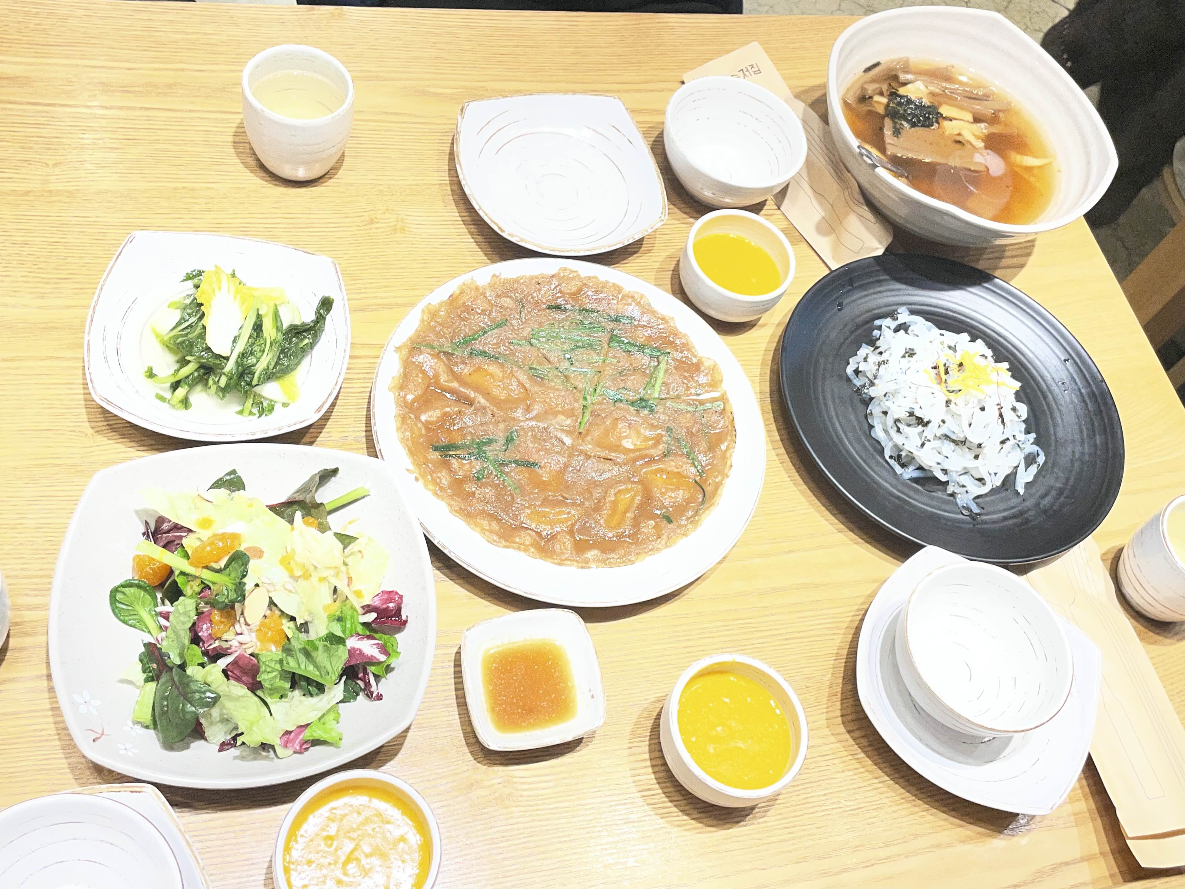 주문하자마자 먼저 도토리전과 탕평채, 샐러드와 호박죽 그리고 온 묵사발이 나왔다.