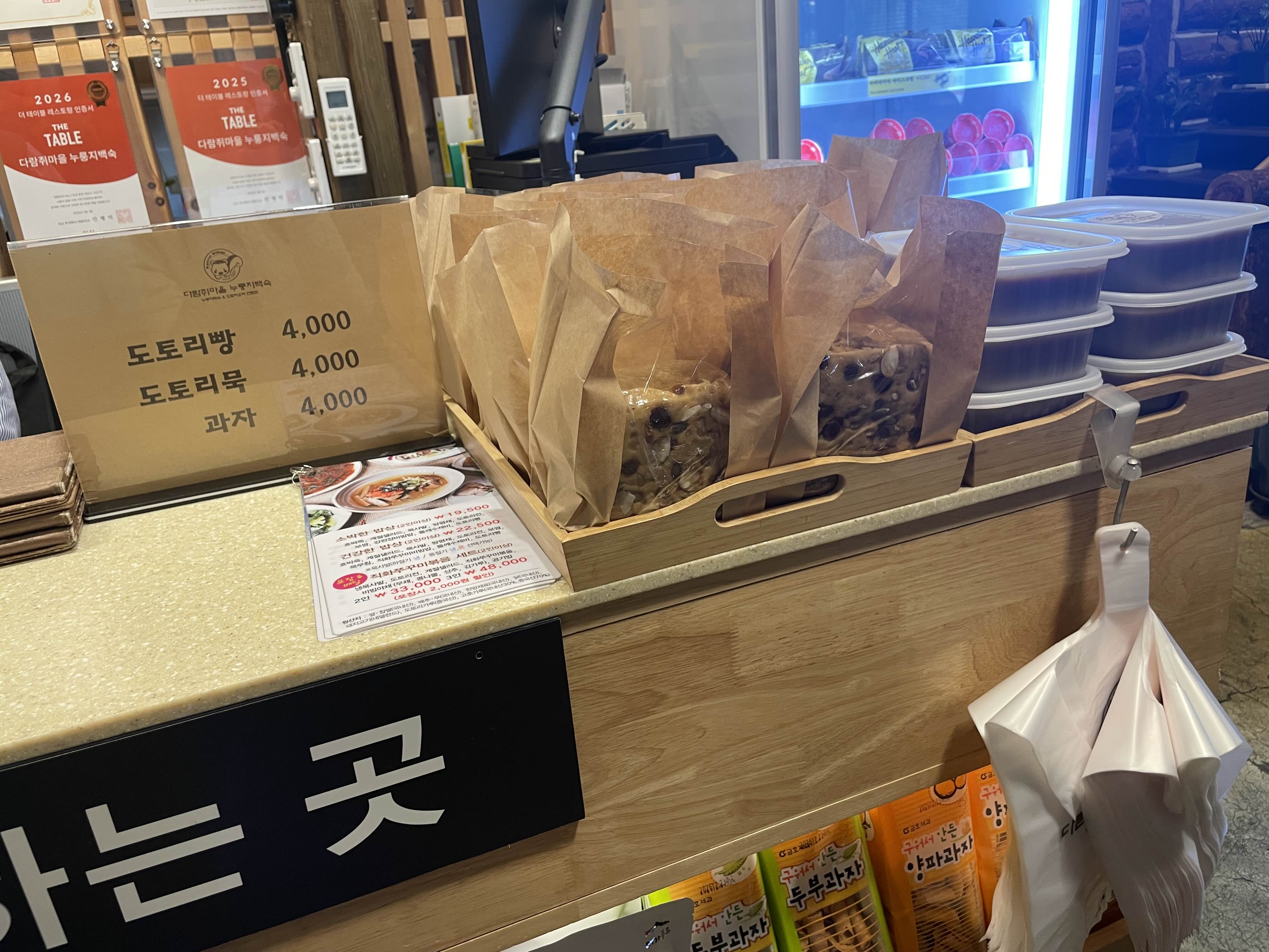계산대에서 도토리빵과 묵 그리고 과자를 판매하고 있는데