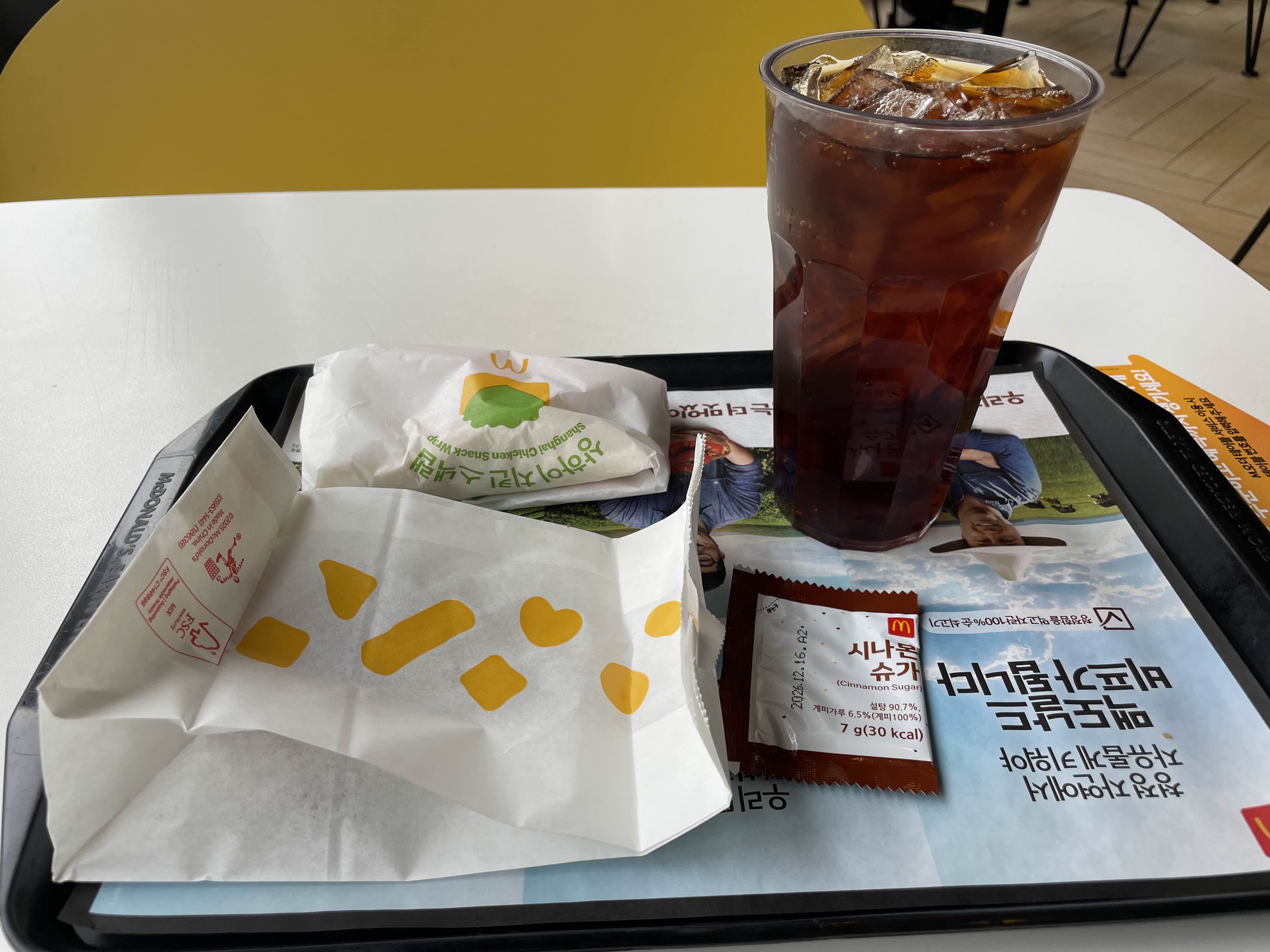 처음엔 플레이모빌이 탐나서 해피밀에 츄러스 추가할까 싶었는데 분명 다 못 먹을 것 같아서 스낵랩에 초코 츄러스 그리고 커피를 주문했다.